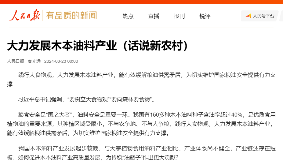 近日,《人民日報》發表了題為《大力發展木本油料產業》的文章,文章深刻指出了木本油料產業在國家糧油安全中的重要地位,并強調了其對于踐行大食物觀、緩解糧油供需矛盾的積極作用。